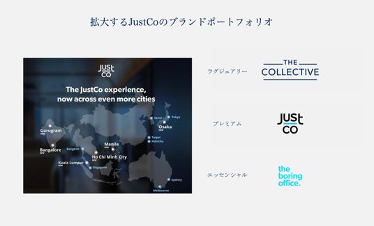 JustCo(ジャストコ) は、2011 年にシンガポールで創業し、現在はアジア太平洋地域 の主要10都市でシェアオフィス&コワーキングスペースを運営しています。インテリジェントな空間設計と革新的なソリューションを通じて、企業、人、そしてアイデアをつなぐアジア太平洋地域を代表するフレキシブルワークスペースパートナーです。ラグジュアリーブランド THE COLLECTIVE(ザ・コレクティブ)、プレミアムブランド JustCo(ジャストコ)、そしてエッセンシャルブランド the boring office (ザ・ボーリングオフィス)の 3 つのコワーキングブランドを展開し、多様化する働き方に対応しています。