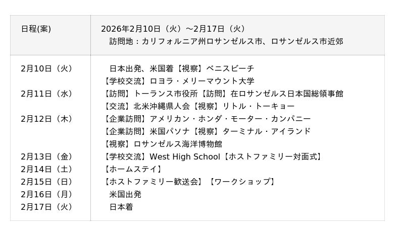 沖縄の高校生が米国カリフォルニア州を訪問し、国際交流やホームステイ、各視察先訪問を通じて、両国の政治、経済、文化、外交政策等について理解を深めるとともに、日本そして沖縄の魅力を積極的に発信します。