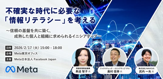 SNS戦略設計を軸に企業様や地方自治体様のコミュニケーション支援サービスを提供する株式会社NAVICUS(本社:東京都千代田区、代表取締役:武内 一矢、以下:NAVICUS)は、2026年2月17日(火)にMeta日本法人 Facebook Japanが主催するシンポジウム「不確実な時代に必要な『情報リテラシー』を考える ~信頼の基盤を共に築く、成熟した個人と組織に求められるイニシアティブ~」に、代表取締役の武内一矢が登壇することをお知らせします。