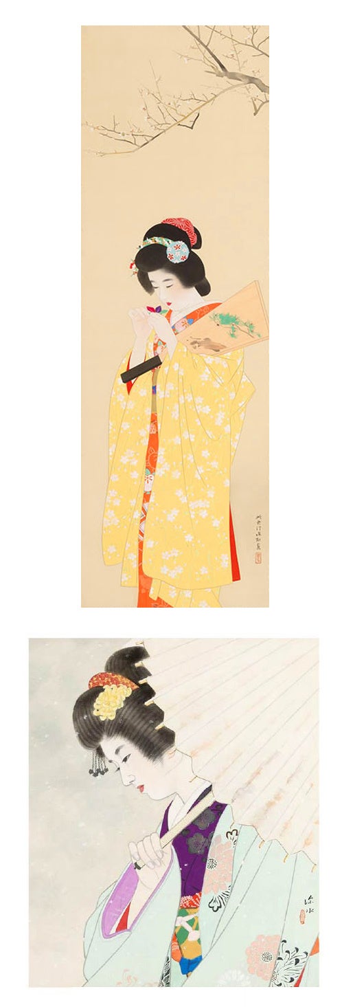 伊東深水東京・深川に生まれ、若くして美人画の大家・鏑木清方に入門。歌川派浮世絵の系譜を受け継ぎ、時代を映しだすその画風が広く親しまれた、大正・昭和を代表する日本画家です。流麗な筆致と明快な色彩によって、はつらつとした気配のなかに、ほのかな色香を宿す女性像を描きだし、その女性美は深水風として高く評価されてきました。 本入札会では、深水の美人画の中でも代表的な図柄である「傘美人」を題材とした作品を3点出品するほか、羽子板を抱き羽を見つめる少女を描いた逸品など計9点をご紹介いたします。