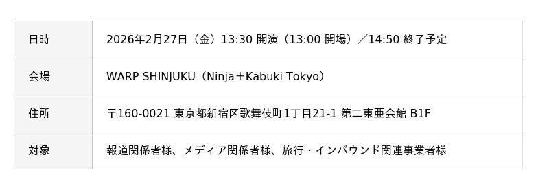 これに先立ち、2026年2月27日(金)13時30分より、報道関係者様、メディア関係者様、旅行・インバウンド関連事業者様限定の先行内覧会(プレビュー公演)を開催します。