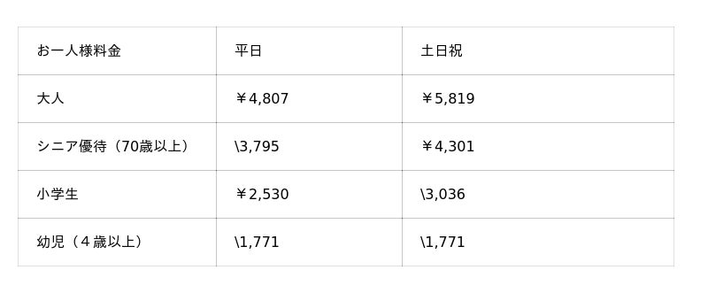 ※4月1日(水)~5月1日(金)の期間中、大人料金は¥5,566となります。