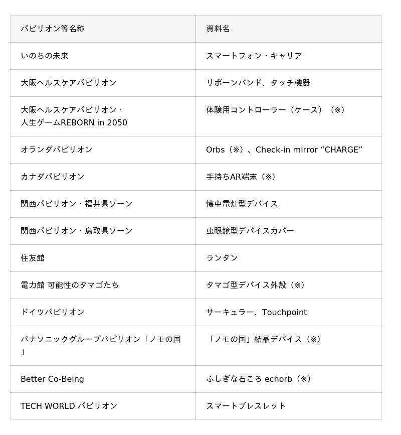 デバイスは原則として、それぞれのパビリオンの中で体験が完結され持ち出されることがなかったため、直接比較できるのは初の機会となります。パビリオンのミッションや企画、思想に基づいたデバイスの造形をご覧いただき、それらの機能を解説します。