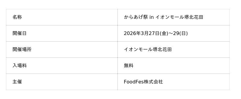 FoodFes株式会社(代表取締役:稲垣一馬)は2026年3月27日(金)~29(日)の3日間「からあげ祭 in イオンモール堺北花田」を開催いたします。