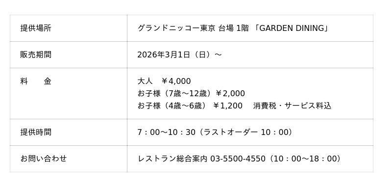 「東京を楽しむ 東京をくつろぐ」ひとときをお届けするグランドニッコー東京 台場(住所:東京都港区 総支配人:塚田 忠保)は、2026年3月1日(日)より、緑と光が溢れる「GARDEN DINING」にて、東京各地に根ざした味わいをブッフェスタイルで楽しめる朝食を「TOKYO MADE MORNING」と名称リニューアルし提供します。