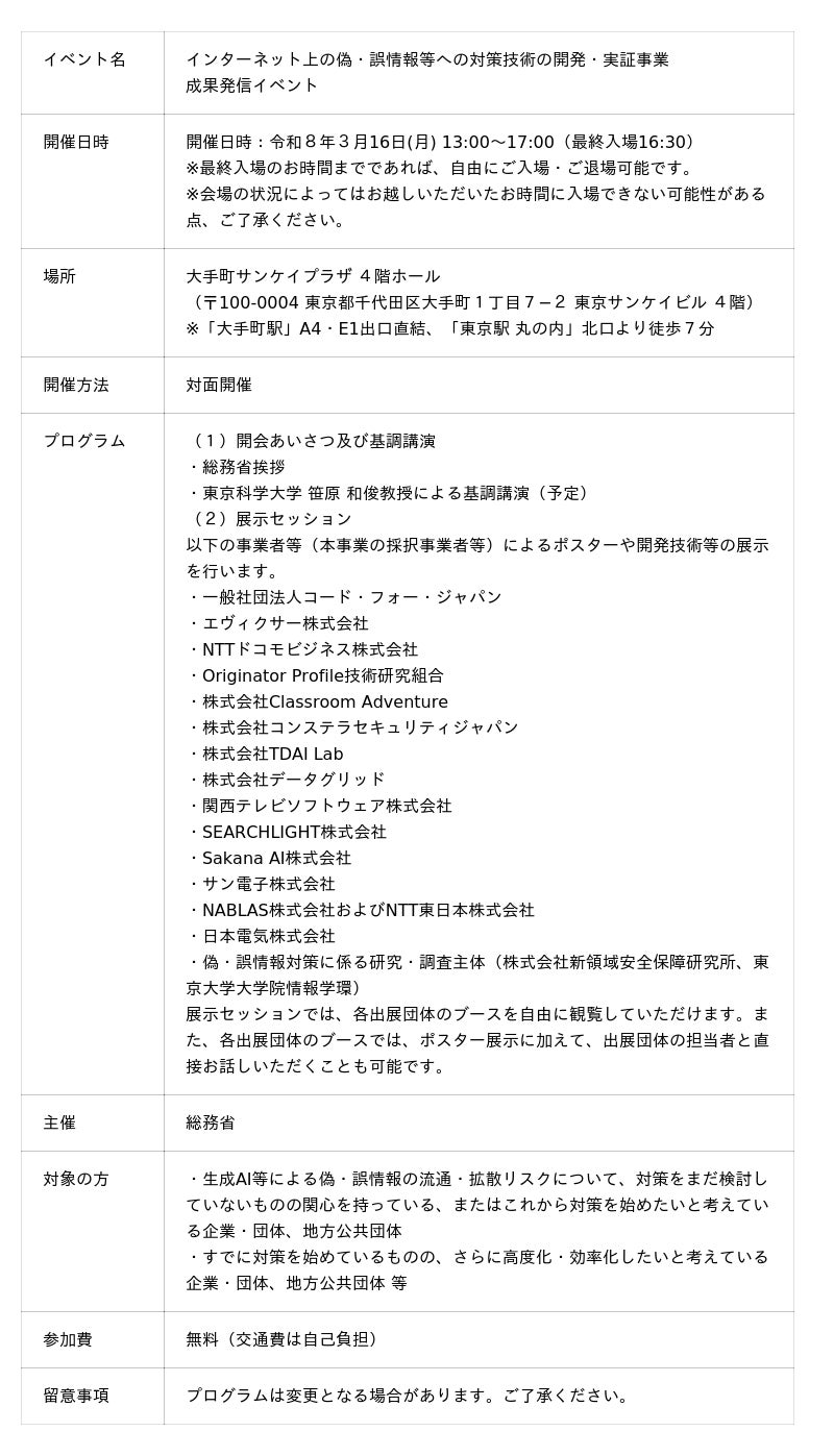 インターネット上の偽・誤情報等への対策技術の開発・実証事業(令和7年度)総務省 報道資料 「インターネット上の偽・誤情報等への対策技術の開発・実証事業成果発信イベント」の開催