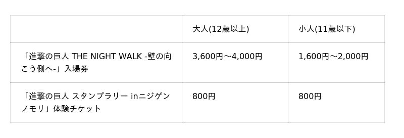 ※「進撃の巨人 THE NIGHT WALK -壁の向こう側へ-」については4歳以下無料