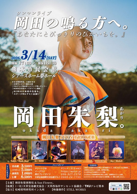 熊本県天草市出身のシンガーソングライター岡田朱梨が、2ndアルバム『おまもり。』のリリースを記念して、2026年3月14日(土)に熊本市民会館シアーズホーム夢ホールにて、自身にとって最大規模となるワンマンライブを開催いたします。