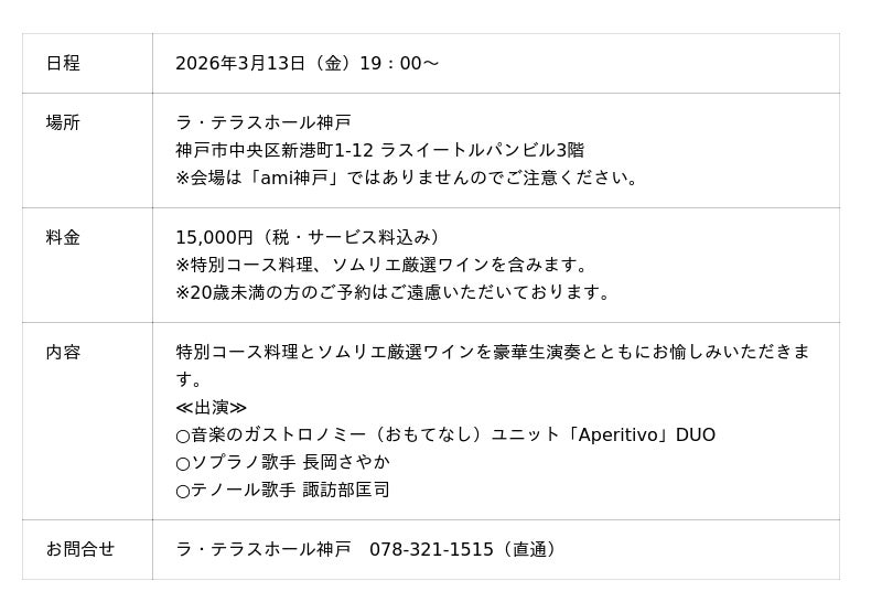 この一年の感謝と、これからのami神戸への想いを込めた祝宴をお愉しみください。