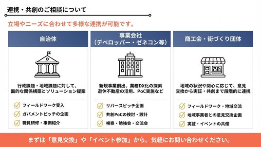 「街づくり・不動産活用ギルド」は、分野横断のネットワークと実践知を活かし、街づくり・不動産・建設分野の課題に向き合う共創基盤として、以下のようなご相談を歓迎しています。■ 自治体の皆様へ
