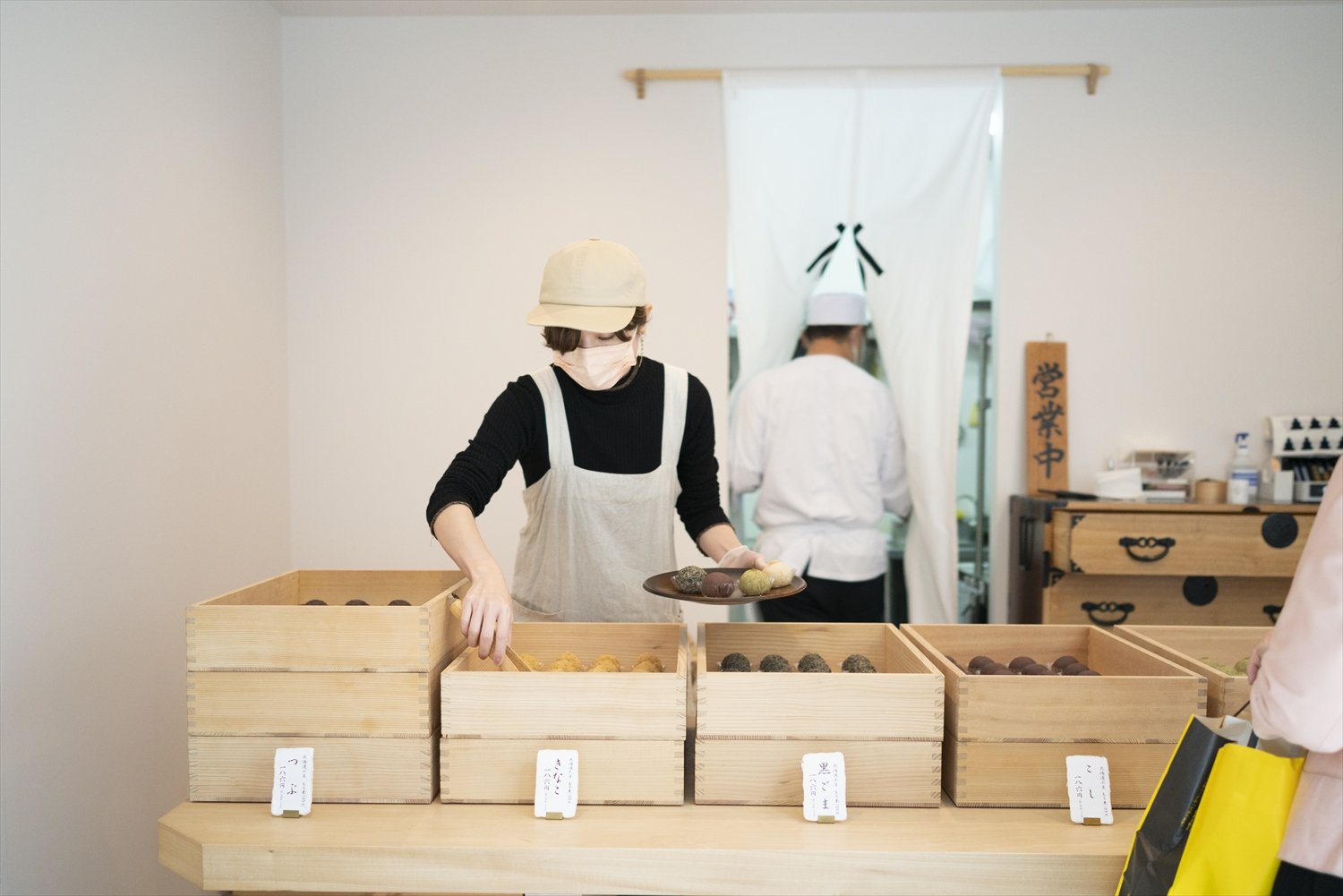 木箱に並ぶおはぎは、定番4種と日替わり2種。ほどよい甘みと硬めのもち米が持ち味。全部手作りなのに値段も手ごろ。閉店前に売り切れることもしばしば。