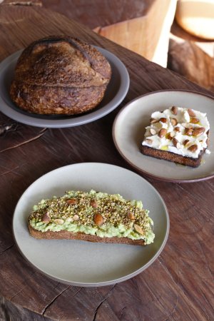 人形町駅から徒歩5分のカフェベーカリー。パンや焼き菓子、ジャム、オリジナルグッズなどがおしゃれな空間に並ぶ。トーストとサンドイッチに使われる自慢のパン・サワードウは、カウンター裏のキッチンで手作り。夜営業でのみ提供される食事系のパンメニューは、お酒と一緒に楽しもう。