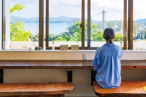 無添加あぐー出汁スープには、ミネラル豊富な「屋我地(やがじ)の塩」が使われ、全粒粉にカツオ節を練り込んだ自家製麺とのハーモニーが絶妙。大らかな景色を眺めながら、絶品そばを食べるという贅沢なひとときを。