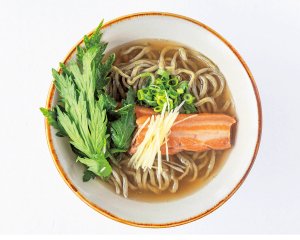 イチオシは生地にフーチバー(ニシヨモギ)の葉を練り込んだ、一日30食限定の「ふーちばーそば」。トッピングの三枚肉はプルプルとやわらかく、しっとり。店主は「人生は一度きりだから」と脱サラ後、すべて独学で開業した。