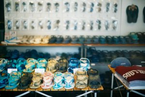 地元の雑貨製造所卸会社が事務所の一角に開店したビーチサンダル専門店。漁師御用達のPEARL印のギョサンは湘南ネイビーなどのオリジナルカラーが10色以上あり、ほかにも多種多様なラインナップがそろえられている。