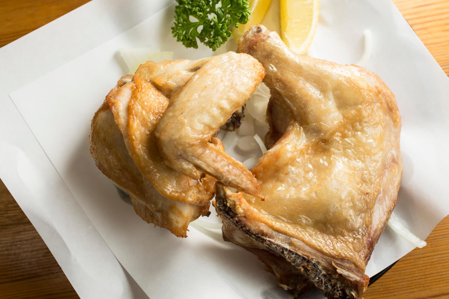 蒲田の名店「なか川」の味を引き継いだ鶏の素揚げの人気店。塩をなじませた鶏がパリッと揚げられ、鶏本来のコクとジューシーさに瞠目(どうもく)する。煮物や漬物、煮卵などから選べるお通しは3品600円。