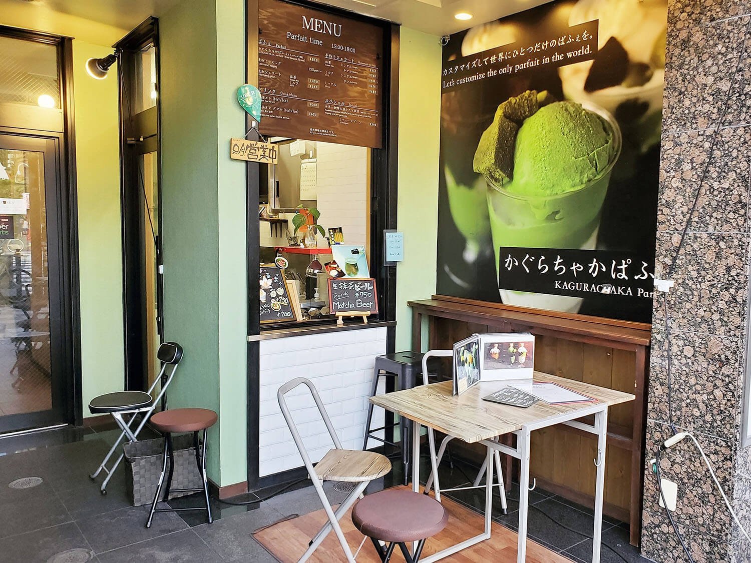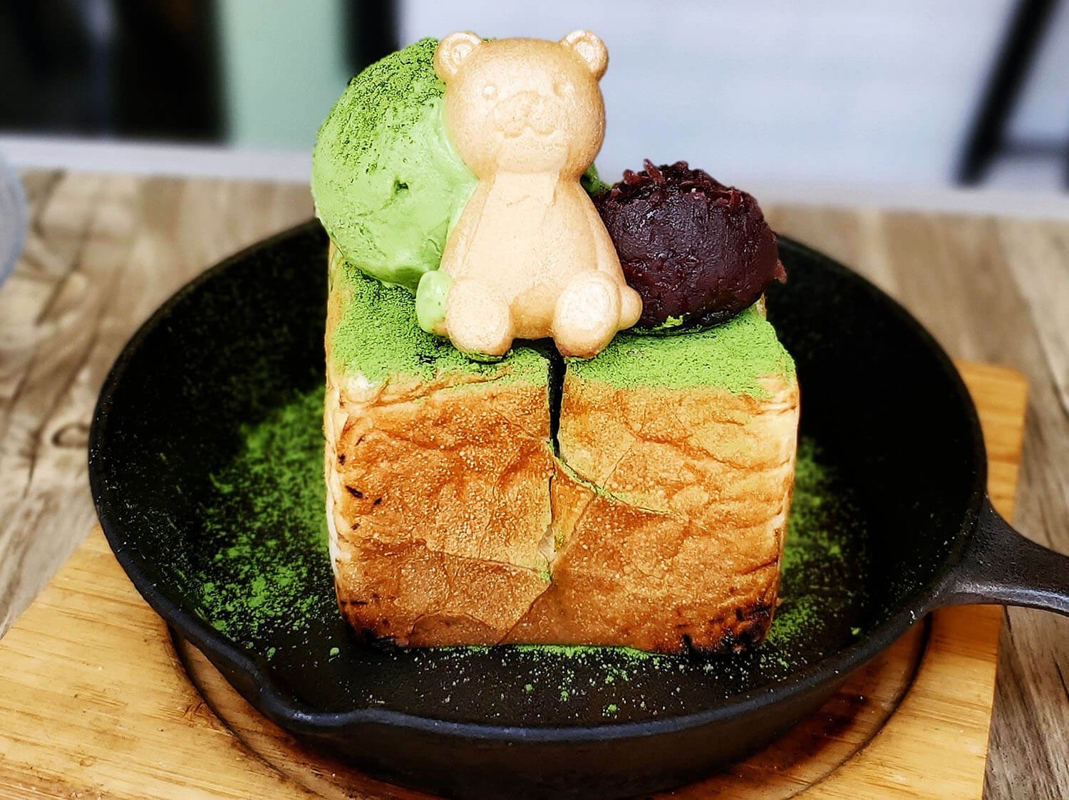 抹茶にこだわった小さなカフェ。クマ型の水ようかんに抹茶をかける抹茶アッフォガードや、抹茶トーストセットが人気。