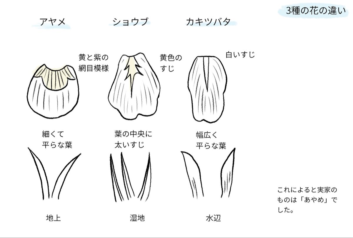 両親が毎年、こどもの日に菖蒲湯(菖蒲の葉を湯船に浮かべて薬効を得る風習)を沸かしてくれていたのですが、私が入っていたのは、厳密にはあやめ湯だったようです。違いがよくわかってなかったなぁ(調べてイラストにかきおこしてみました)。