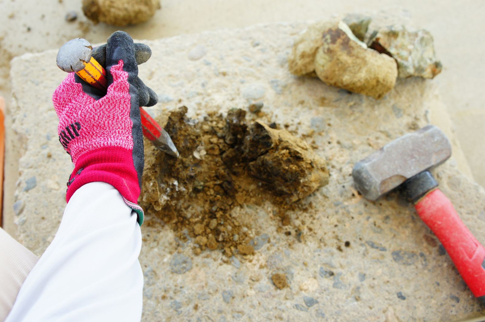 うまいこと粉々に割れた石から、化石を探します。これは!というものをスタッフさんに見せて「石ですね」といわれ、しょんぼり。あとはひたすら割って探してを繰り返します。