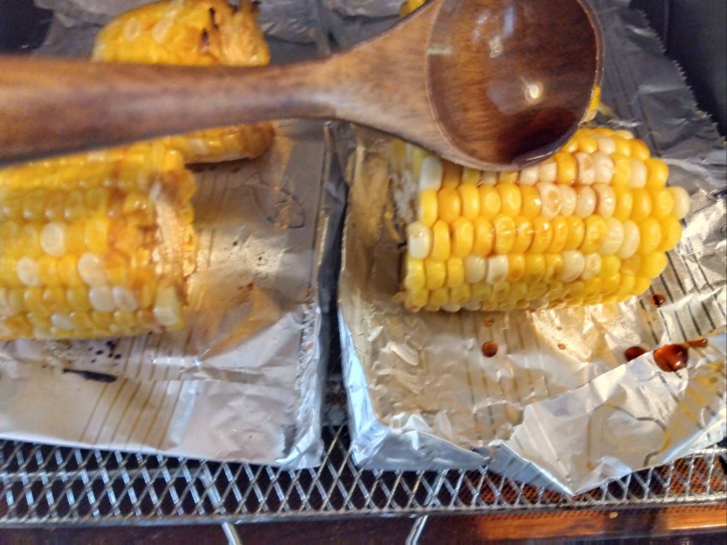 そんなこんなで、1本のトウモロコシの半分は先に醤油をつけ、もう半分はそのまま焼いて途中で醤油をつけることにしました。