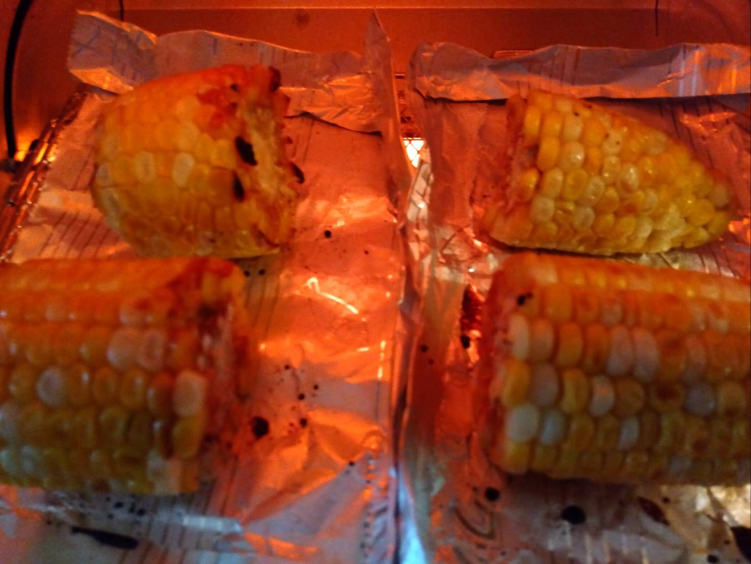 オーブントースターにホイルを敷いて、左側は醤油を先につけたトウモロコシ、右側は焼き5分経過時に醤油をつけたトウモロコシ。途中数回、焼き加減調整でトウモロコシの向きを変え、合計、10分焼きました。