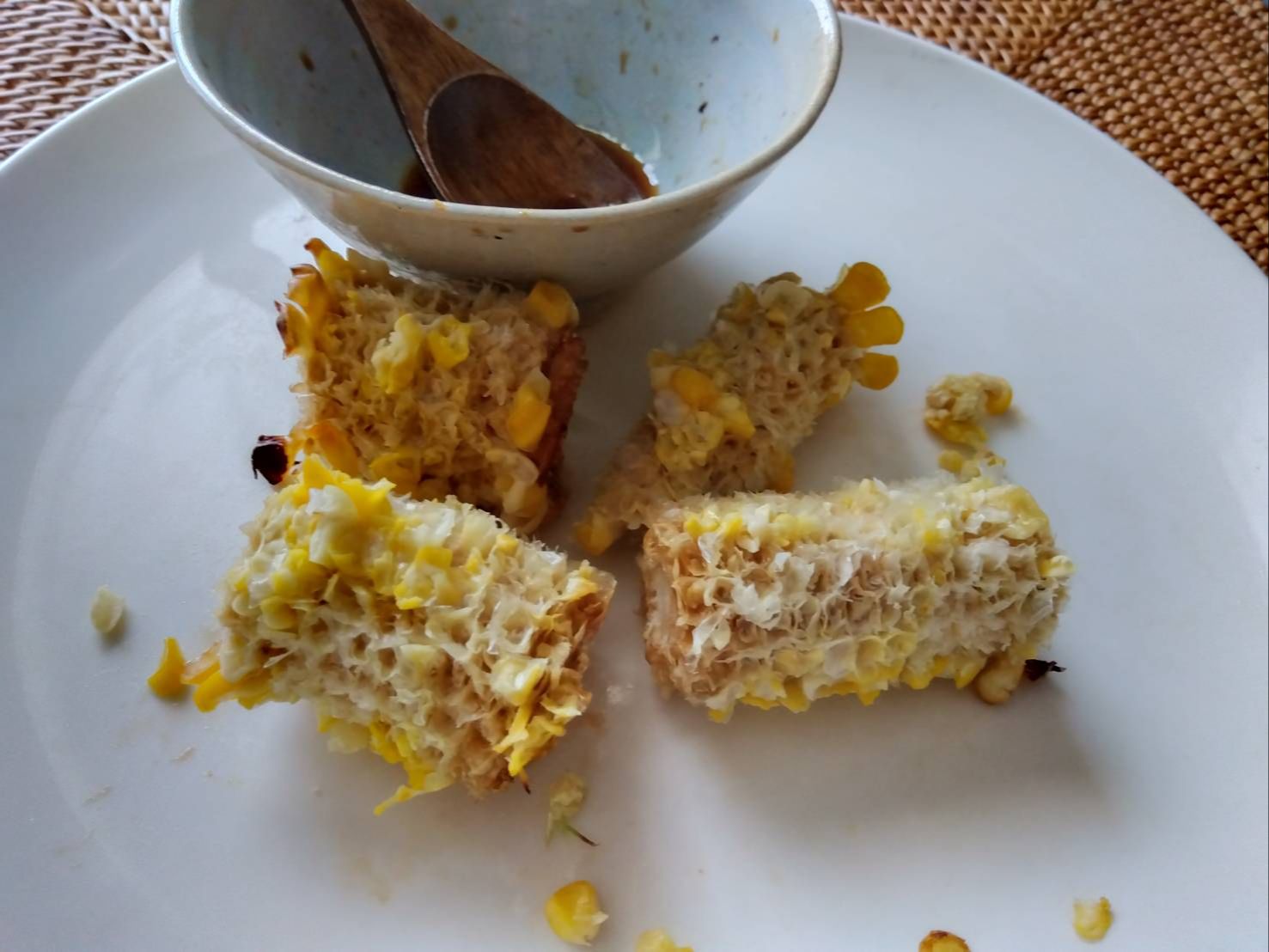 そして、途中で醤油をつけた焼きモロコシは、食べる時に醤油の香りや味が先にきて、トウモロコシから醤油がしたたり、トウモロコシ本来の甘さよりも、醤油に牽引されたかんじ。双方の瑞々しさはあります。