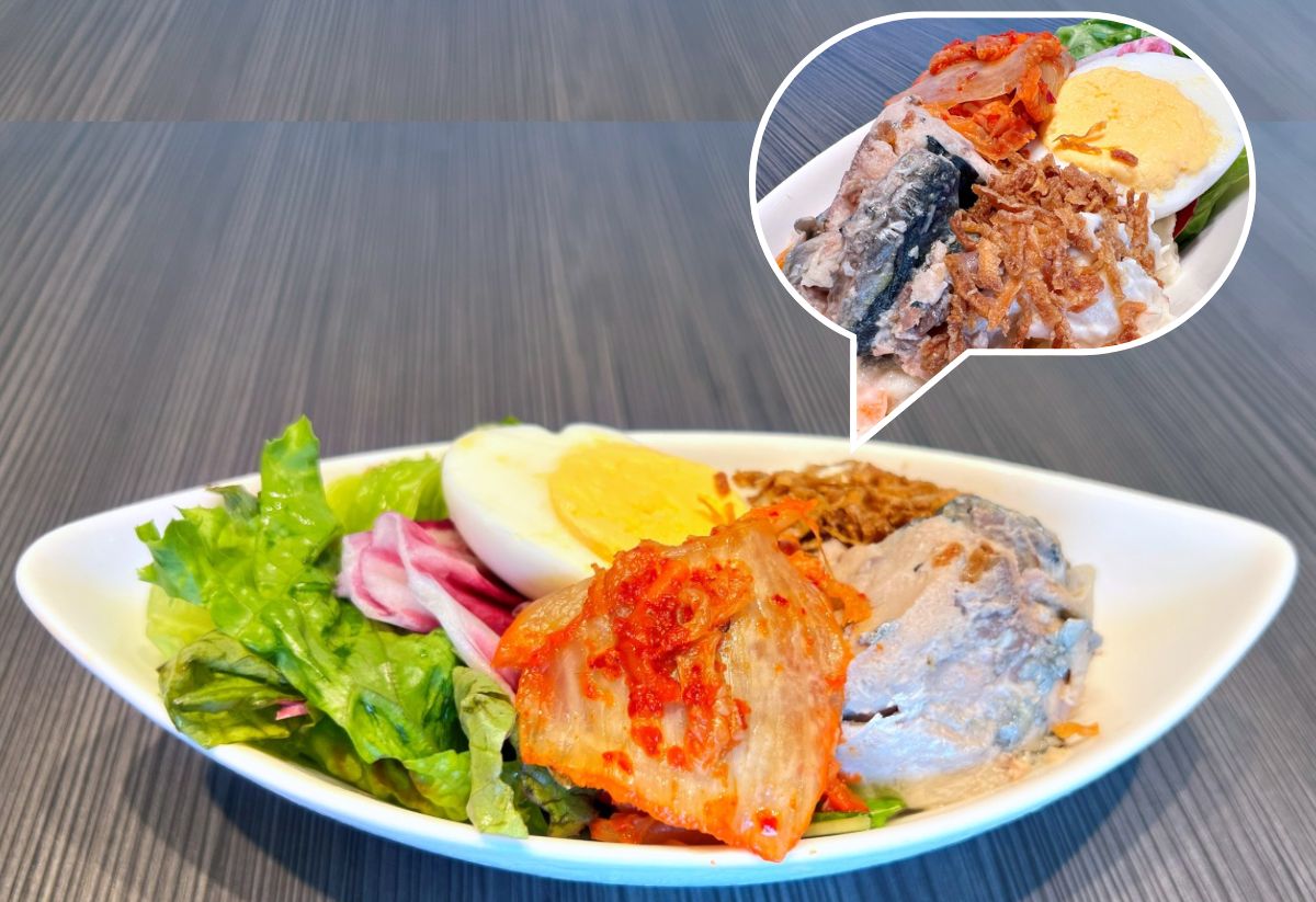 ポテトサラダのクリーミーで優しい味わいが、キムチの強い風味やサバのしっかりした旨味を包み込み、全体をまろやかにまとめています。