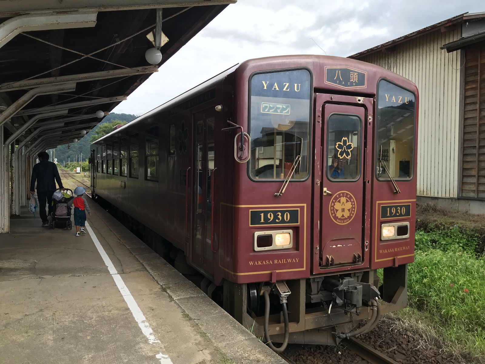 駅に吸い込まれるようにやってきたのは「八頭(やず)号」。乗車し、窓越しに駅舎を眺めると、日常と非日常が溶け合う不思議な景色に出会える。