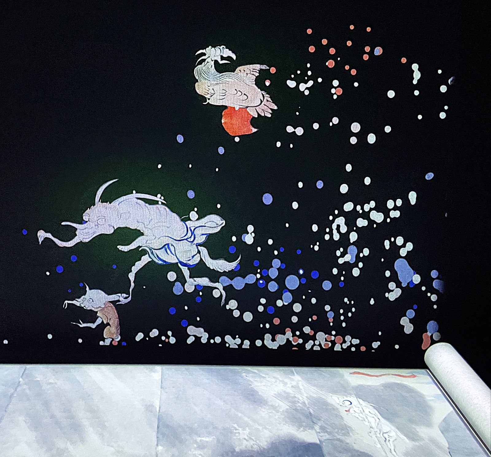 博物館には「チームラボ妖怪遊園地」というコーナーがあるのですが、これがめっぽう楽しい。自分で描いた妖怪がスキャナーに取り込まれ、気が付いたら大スクリーン上で大勢の妖怪たちと一緒に闊歩してます。