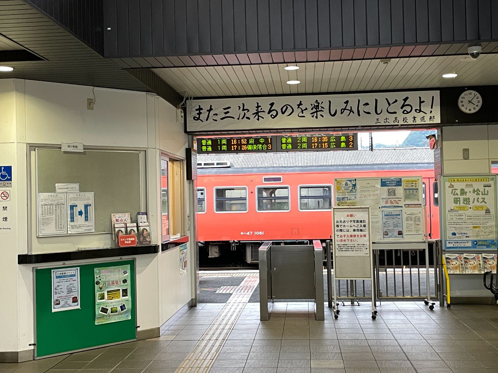 広島駅から三次まで行くダイヤは、ほぼ1時間に1本程度。