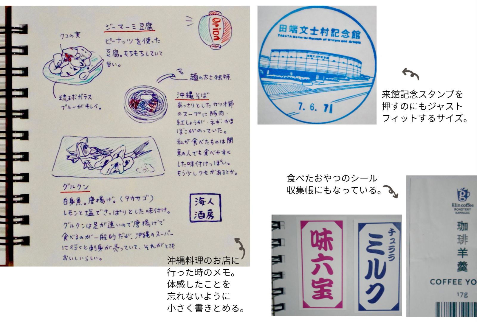 3色ボールペンで簡単にスケッチ。見聞きした情報をメモしたり、記念スタンプや旅先で見つけたお菓子のラベルを採集しています。