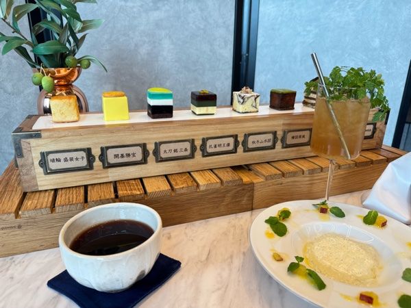 メインのプレートには、古墳から江戸までの時代をめぐる8種のキューブスイーツが並びます。いずれも東京国立博物館の収蔵品をモチーフに再構成されたもので、まさに“博物館を一皿に凝縮した”かのようです。