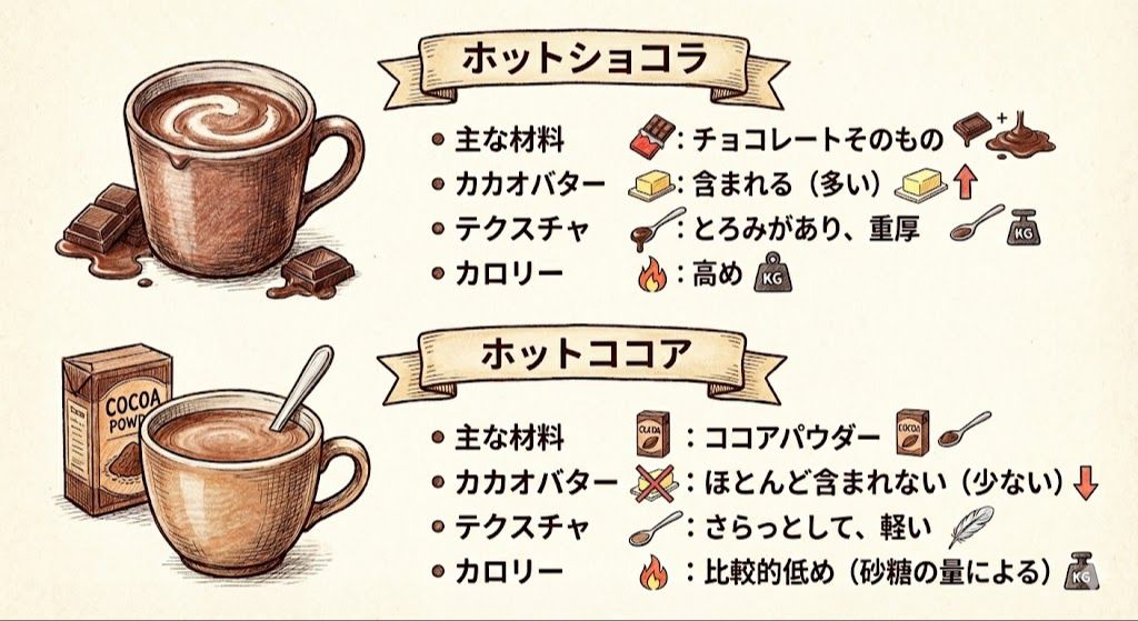 ちなみにココアとショコラの違いがよくわからなかったので調べて、Geminiに画像にしてもらったところ下記のようになっているようです ※間違っていたらすみません