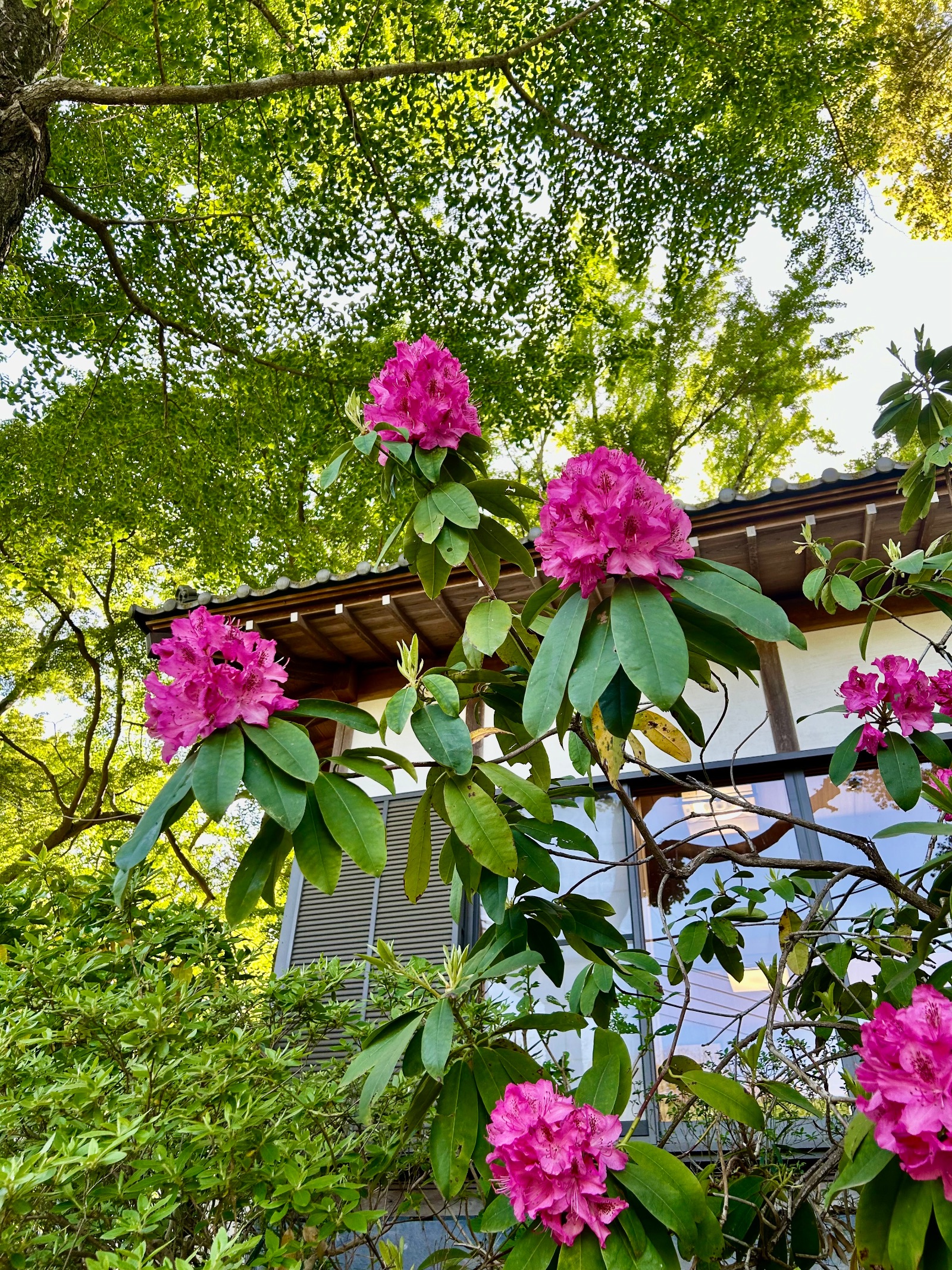 社務所の裏側には鮮やかな牡丹も咲いていて、華やかに境内を引き立てている。