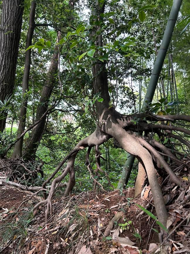 木々を見上げると根っこから、どんな勢いで成長したのかわからないほどの幹や竹を発見する。
