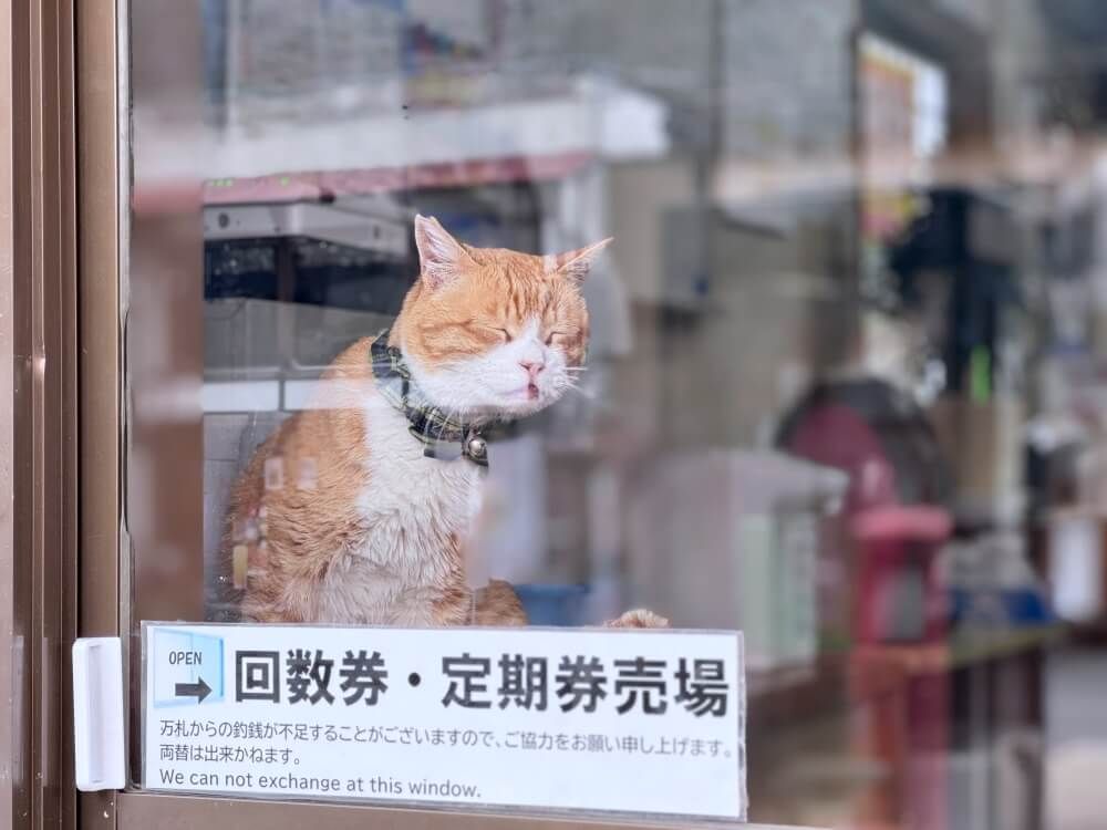 ガラス越しにこちらを見ている。あとで知ったのだが、南木曽町では野良猫を地域で世話する取り組みをしていて、この猫もその一匹らしい。名前は「みぃちゃん」。