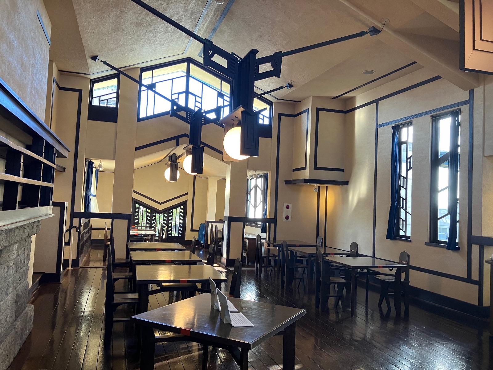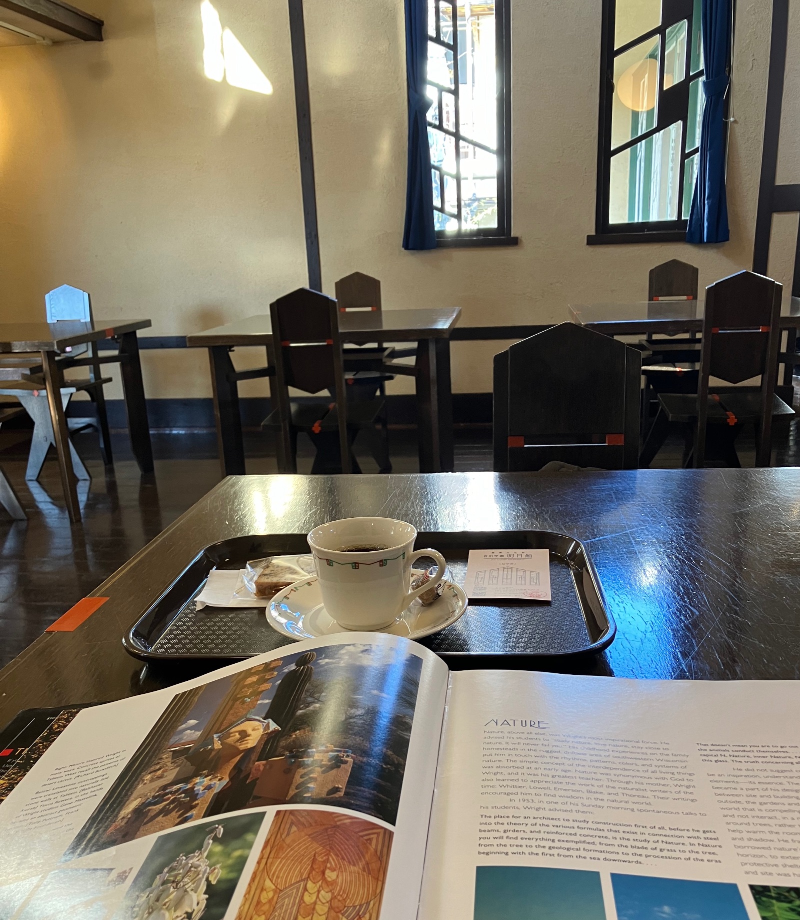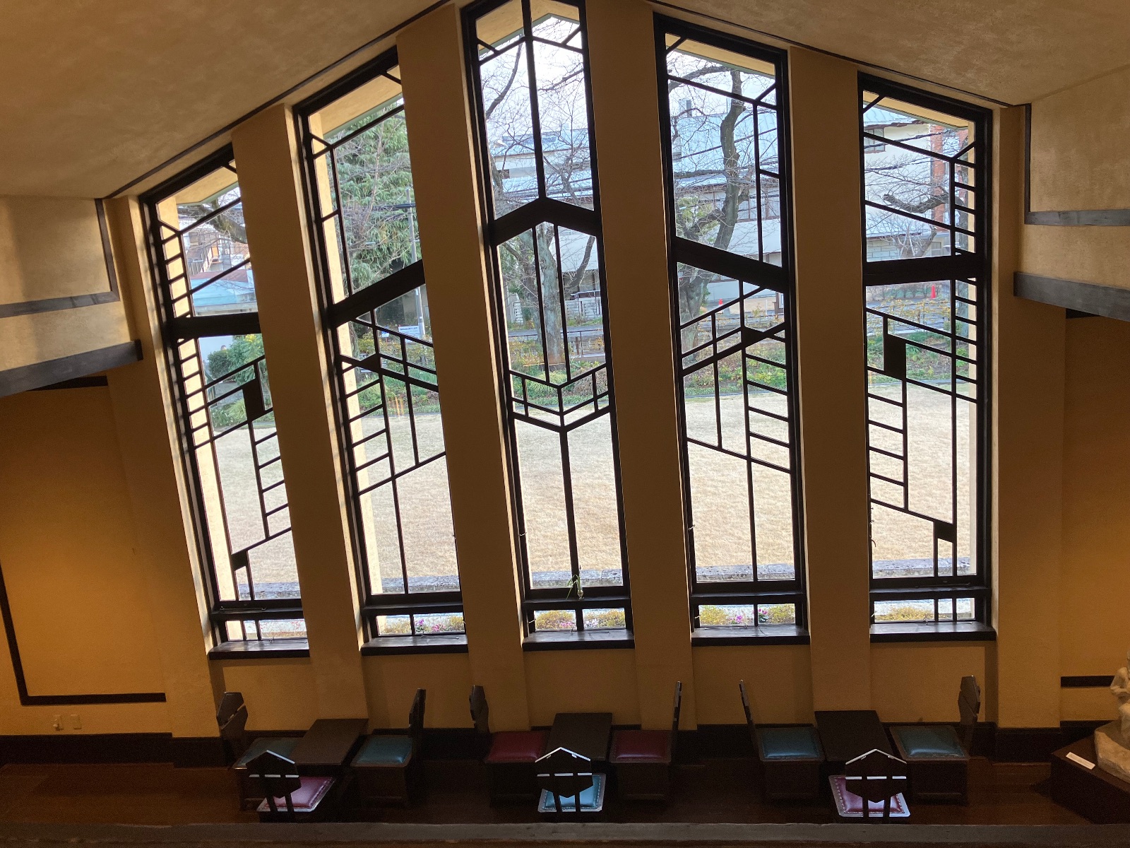 あちこちで目にする幾何学模様も床や柱に使われてる大谷石も自然光を最大限に利用する有機的建築も、建物フェチでフランクロイドライト推しが激しいワタシにとっては鼻息、ため息、お涙モノなのす。