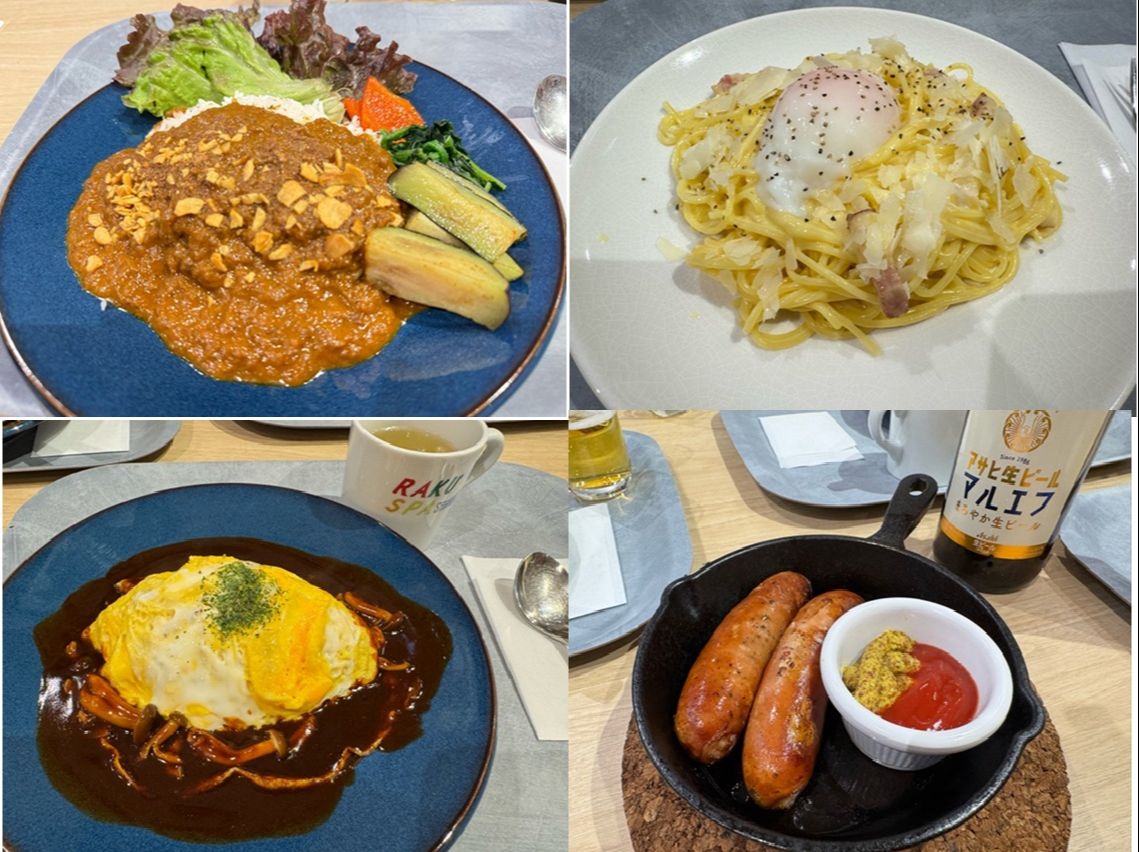 RAKU SPA薬膳カレー、淡雪チーズの濃厚カルボナーラ、きのこの濃厚デミグラスオムライス、ビアグリソーセージを堪能しました。メニューは麺類、エスニック、洋食、おつまみ系、キッズメニュー、デザートまで充実のメニューです。