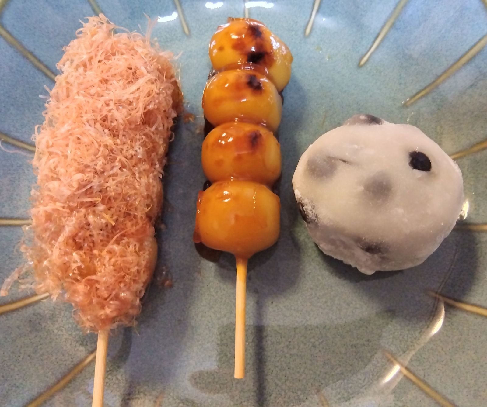 この日は、豆大福、みたらし団子、みたらし団子にかつお節を纏った団子、を購入。