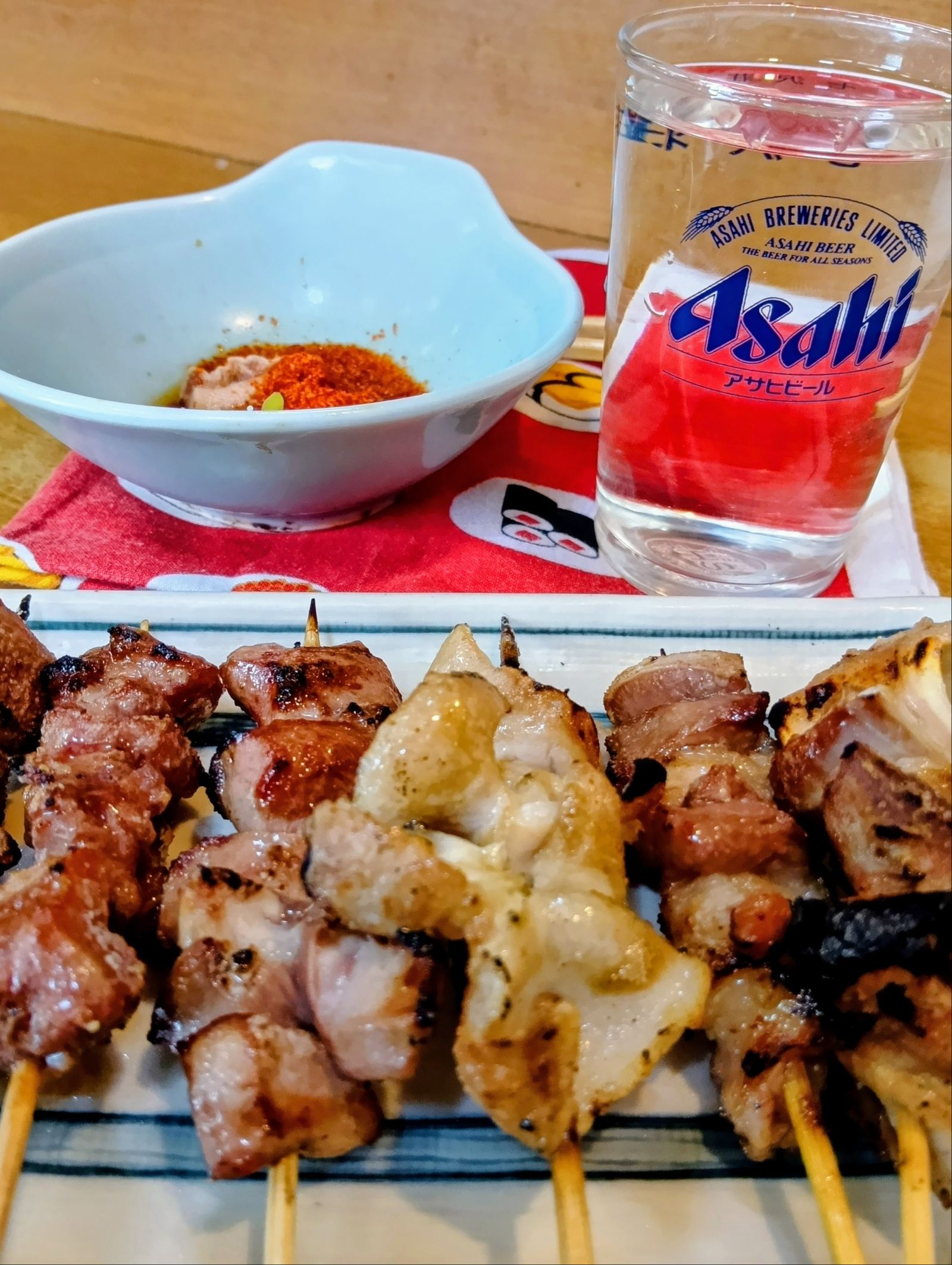 小松湯から徒歩で約10分、川崎駅からだと約20分。筆者の早歩きならもう少し短縮できる。豚もつの卸、島田商店が併設で営む「島田屋」。もつ焼き、煮込み、もつ刺しがメインだ。しかも、1本=80円という爆安。1000円あれば、サクッと飲んで、しっぽり食べて帰ることができる川崎飲兵衛の聖地だ。店内はカウンターとテーブルがあり、20数席で満員になる。地元にあれば毎日通いたい店。私の注文はいつもきまっている「あるもの全部、塩で」。写真は、ナンコツ、カシラ、シロ、タン、ハツ、レバ、で6本=480円だ。まさに、大人の駄菓子屋。コップ酒を注文し、豚の油を日本酒で流し込む。うーん、言葉が出ない。