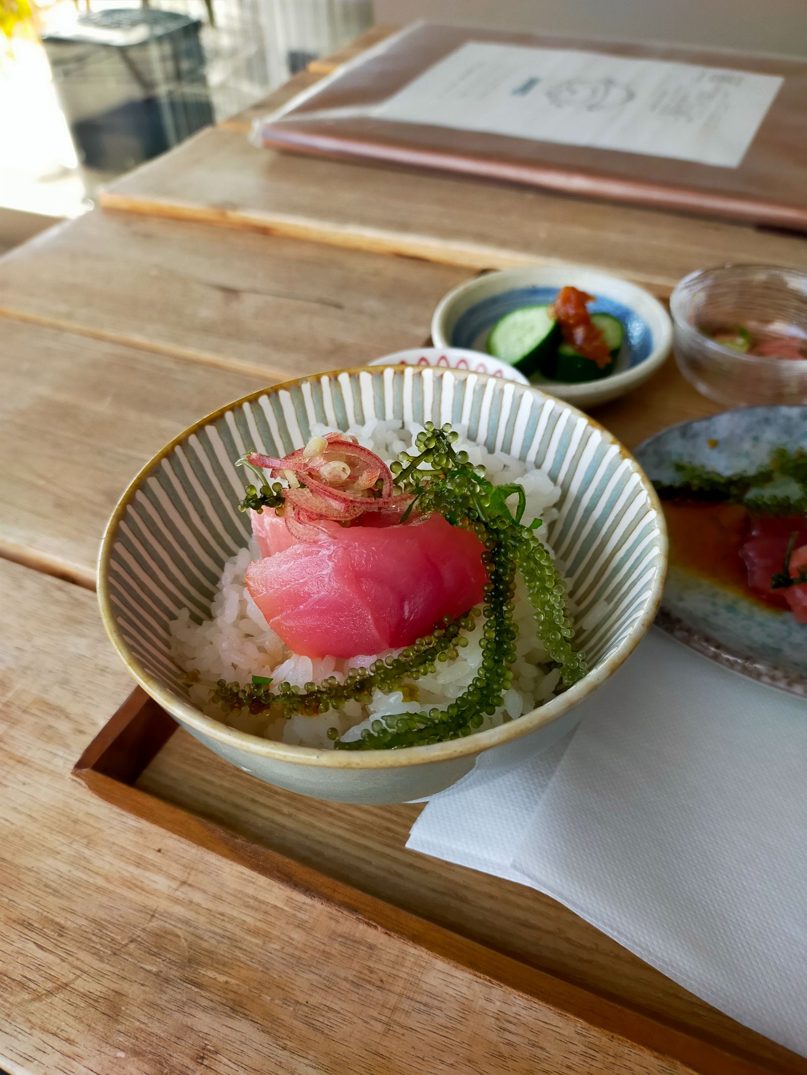 沖縄物産店で以前買った海ぶどうがしんなりしてたので、プチプチしたのが食べたい。ということで、海ぶどうとろろマグロ定食に決めました。