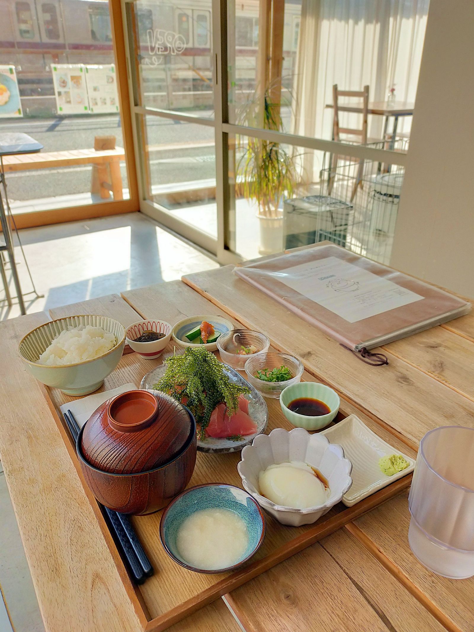 席に着いて待つこと10分ちょっと。メニュー写真より、マグロも海ぶどうもてんこ盛りの定食がやってきました。これは嬉しい。