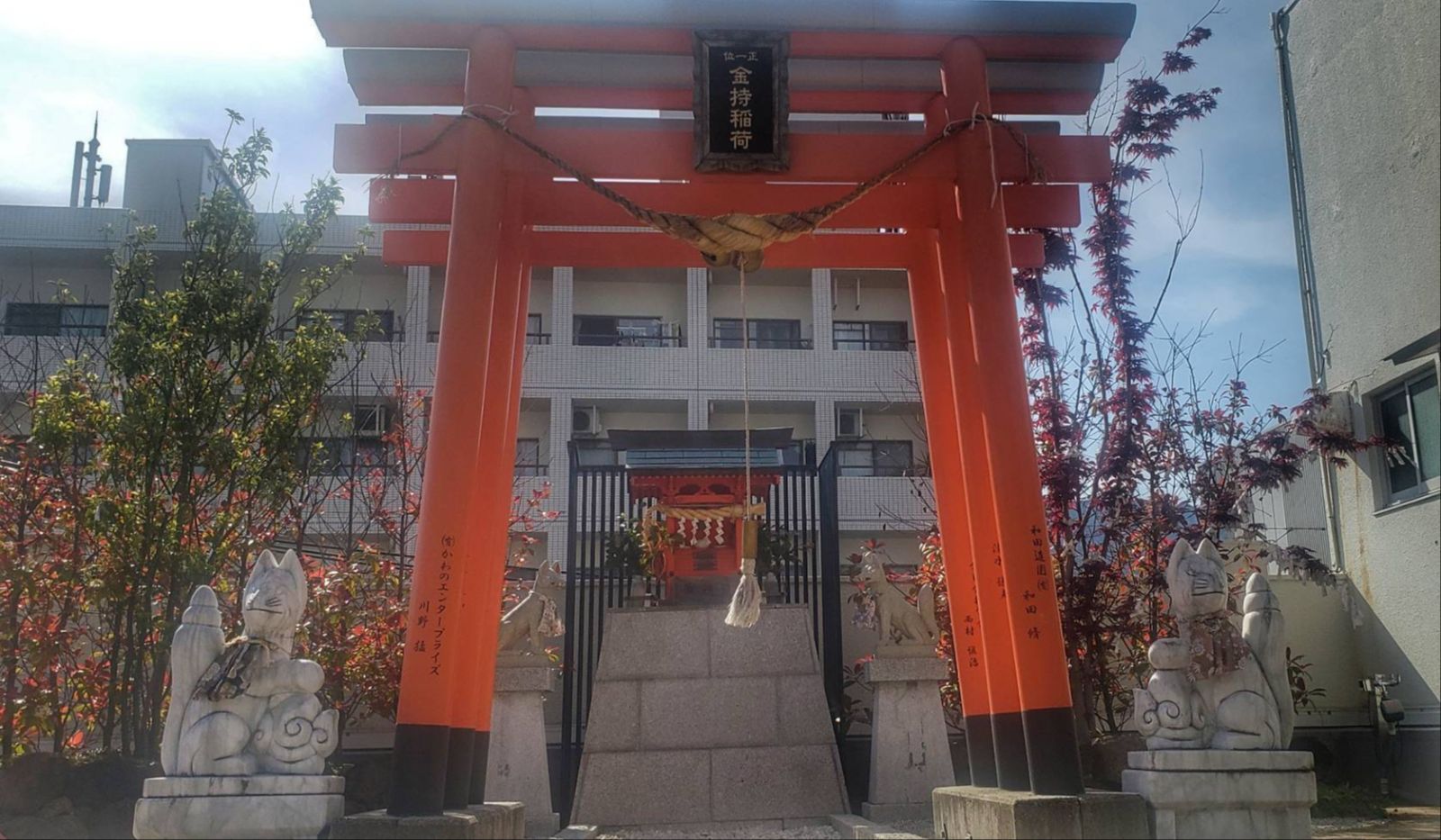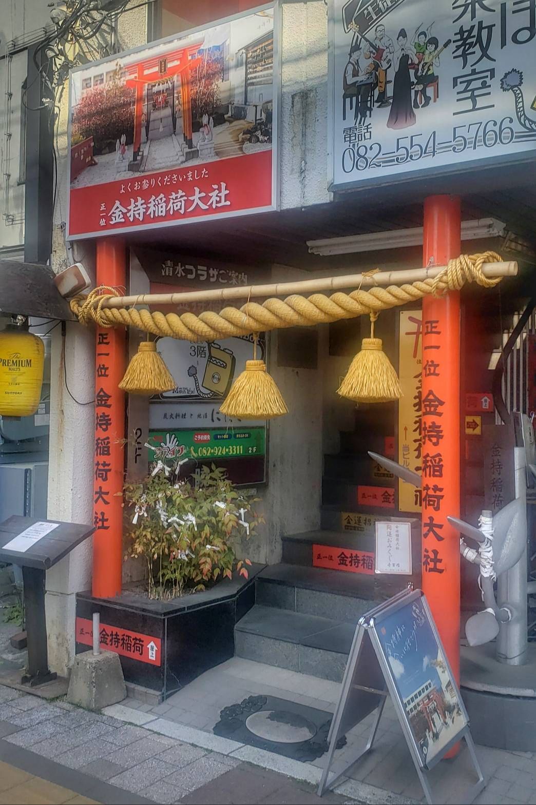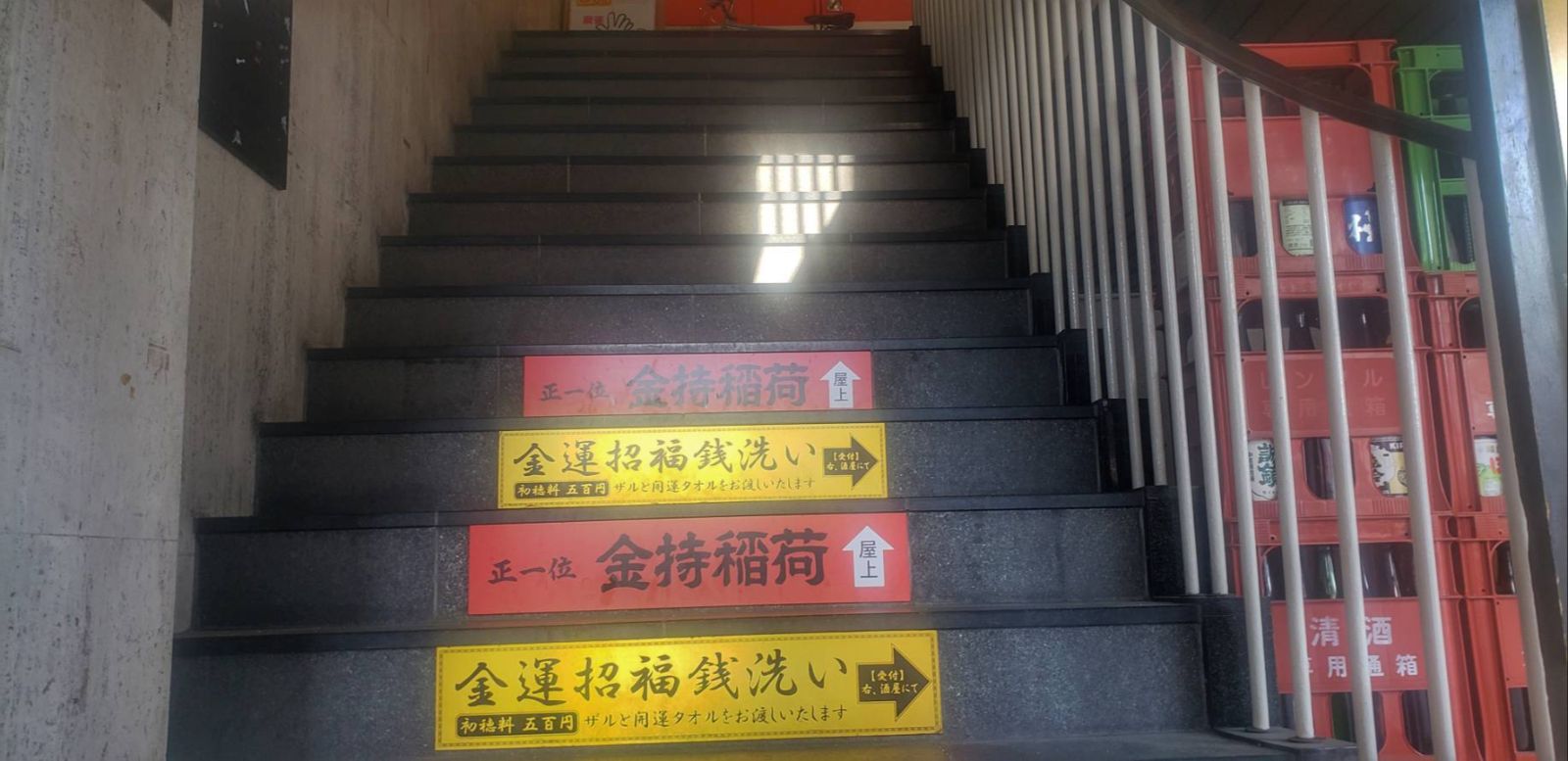 商店街を歩いていくと、「金持稲荷大社」と書かれた看板が見えてくる。ただし、よくある神社の佇まいではない。このビルの屋上にあるという。