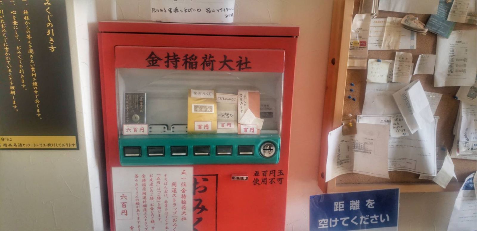 階段をのぼりきると、目に入るのはおみくじの自動販売機と掲示板。そこには、宝くじ当選の報告や、感謝の言葉がびっしり貼られていた。