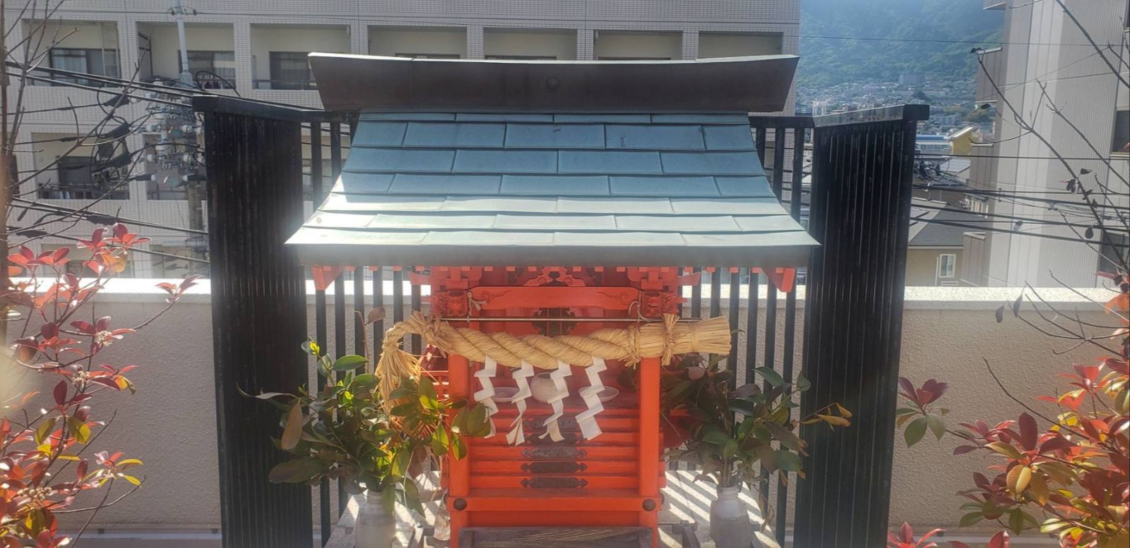 屋上の開放感の中に、ぽつんと佇む小さな社。赤い鳥居と社殿が、やけに鮮やかに見える。