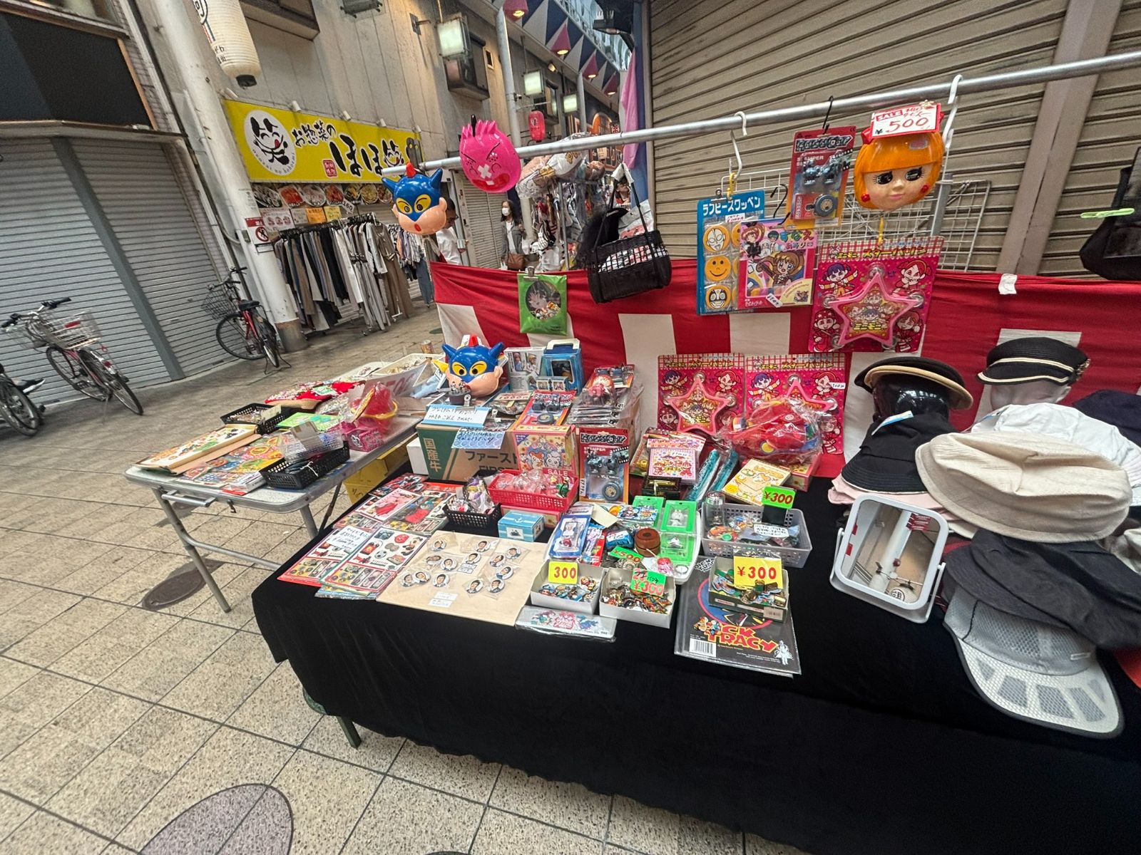 路上で販売しているのは野菜だけではありません。画像のようにお面やおもちゃ、帽子や福なども販売しています。アーケードなので雨の心配もなく路上で販売しています。これは週末のイベントで行われるマルシェと違い、リアルマルシェですね。