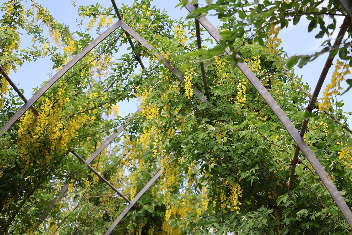 日本の気候では育成が難しいといわれている「きばな藤」、ホントは藤とは別物らしいが、もあったのですが、時期的にはやや早かったよう、トンネルでは殆ど咲いておらず、気の早い数本が花をつけているだけでしたが、黄色い花が青い空に映えてきれいでした。5月中旬から始まる薔薇のころには一緒に見事に咲くのでしょう。
