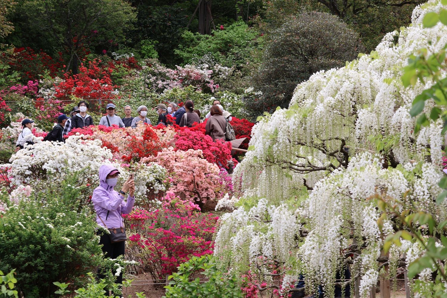 様々な色や形の藤や躑躅などをゆっくり見て2時間強、園内が広かったこともあり、覚悟したほどの混雑感もなく有意義な時間を過ごすことができました。多数いた外国の人たちにも日本固有の藤の美しさには満足してもらえたことでしょう。