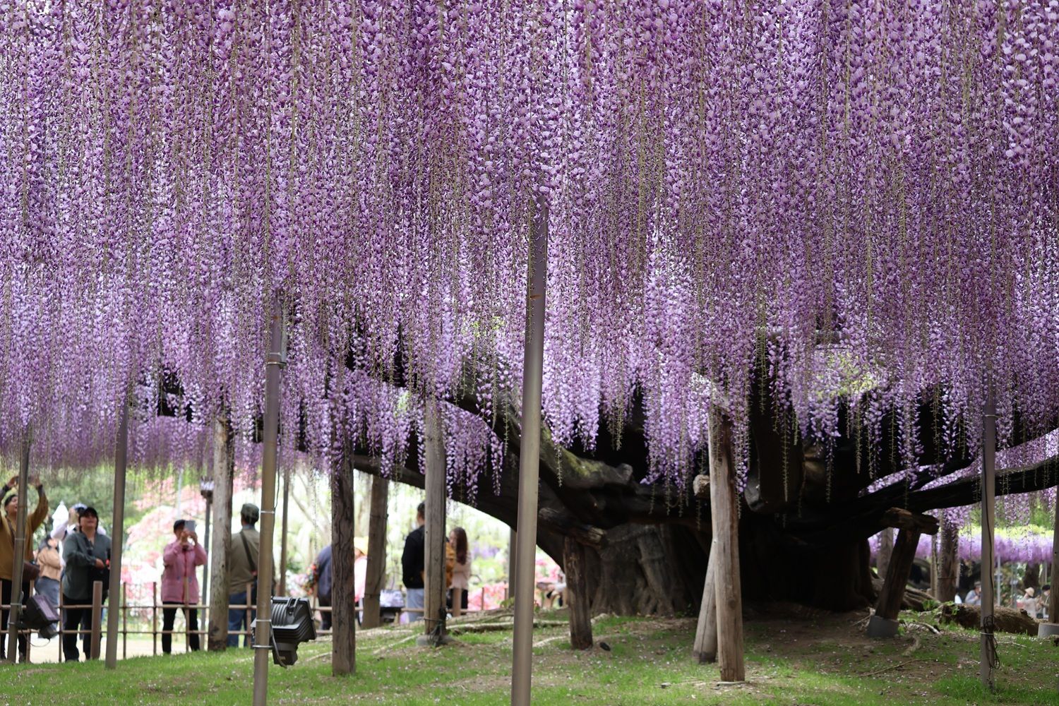 大感激しながらしばらく進むと、今度は右手には今日のメインイベントともいうべき巨大な藤棚がみえてきます。二つの大藤は小道を挟んで左右に一つずつあり、広さは1,000㎡、それを支える古木は樹齢160年といわれる栃木県指定天然記念物です。もっと有名な藤の木もありますが、この藤は満開であったこともありホントすごかった。