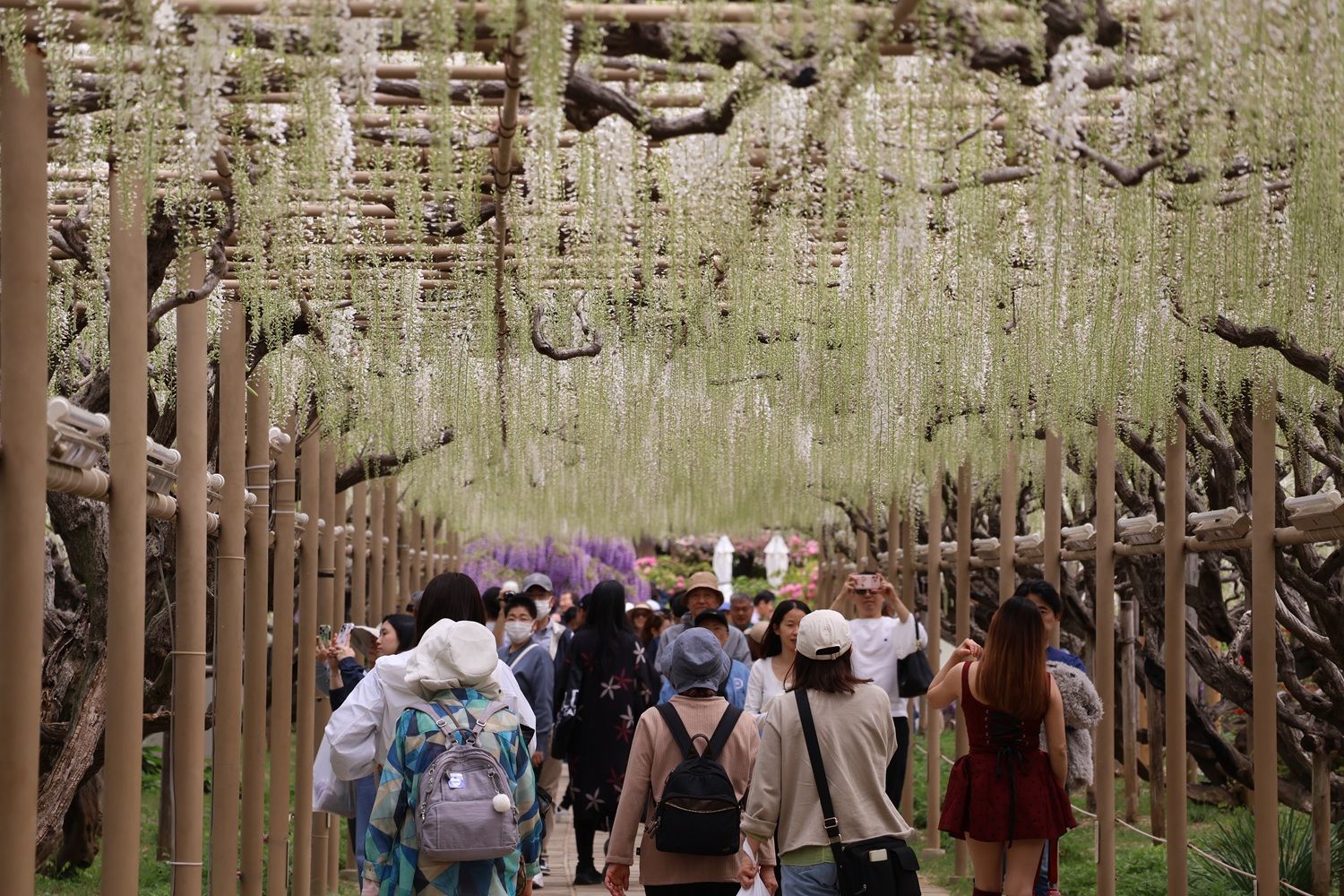 折り返してこの大藤を左に見て進むと今度は白藤のトンネルにつきました。見頃ではありましたが50~60%の咲き加減でチョットさみしい。多くの人たちがゆっくりと散策していました。